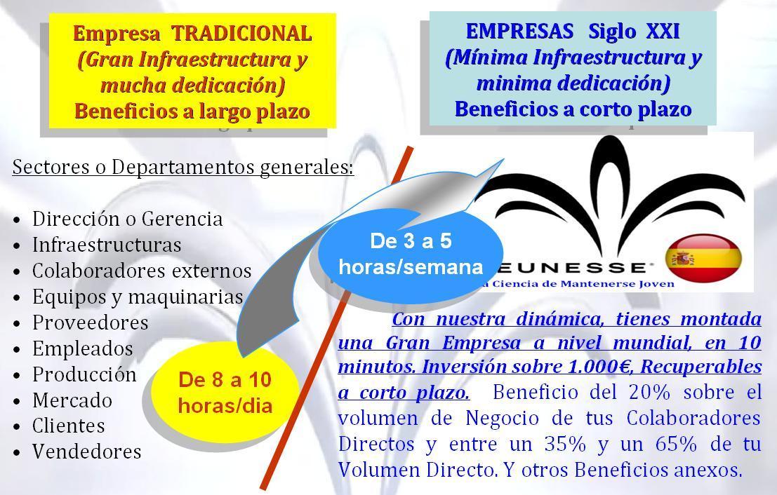 · Sin Limites de Expansión · Mínimo tiempo diario (Tiempo Parcial: 3 a 5 horas/Semana. Tiempo Completo: de 2 a 3 horas/día) · Mínima Inversión recuperada en menos de 60 días (Menor de 2.000 €uros) · Sin empleados · Sin Necesidades de Financiación · Crecimiento y Asentamiento rápido (2 a 3 años, se logra la Independencia Financiera - Trabajandolo a tiempo completo, ingresos de mas de 50.000€/mes) · Independientemente de que estés trabajandolo a tiempo completo o parcial… ¡El Sistema y la Infraestructura de tu grupo creado, siguen funcionando y generando dinero!